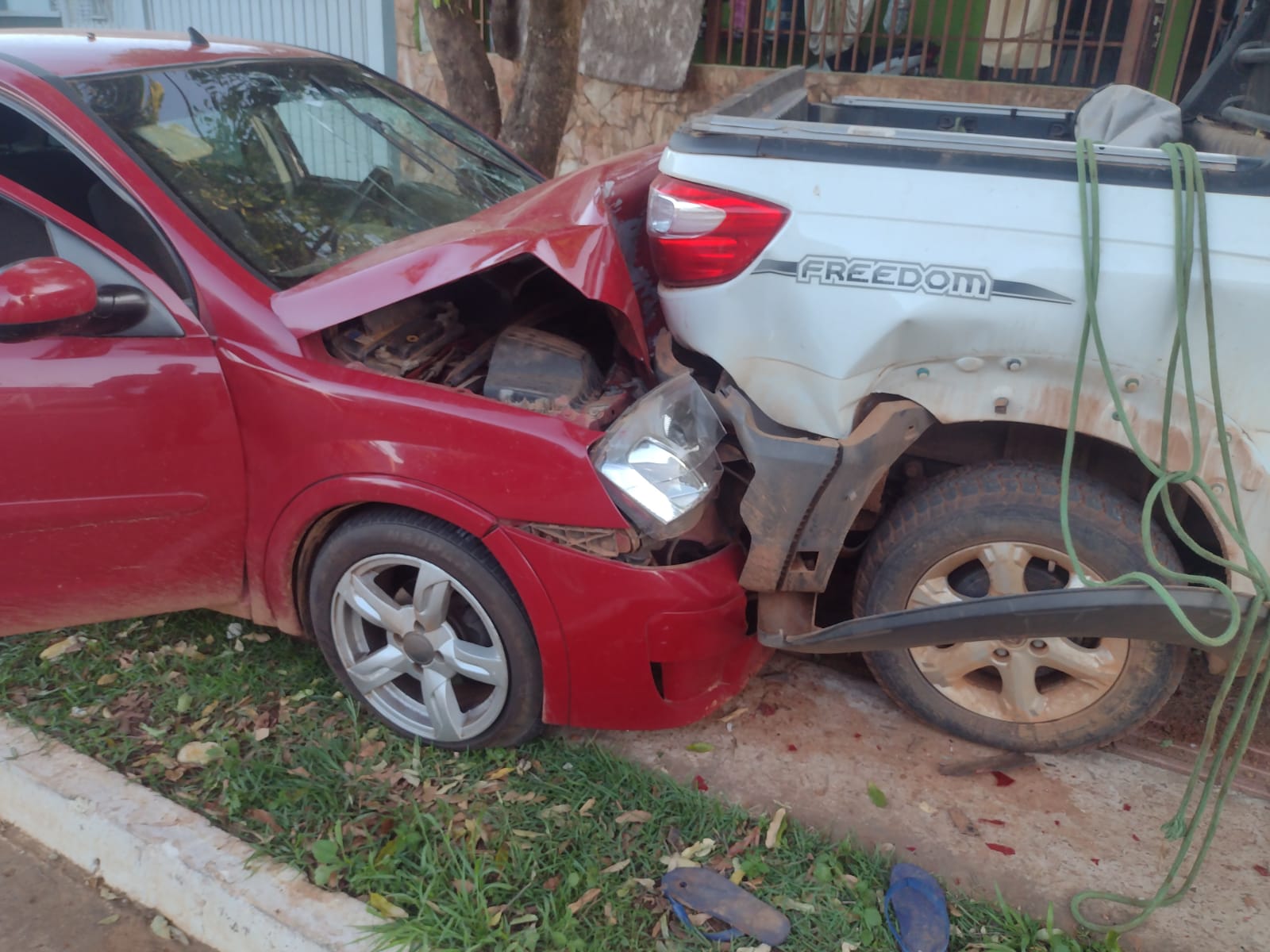 A Policia Militar de Bonito informou que acidente aconteceu no cruzamento das ruas Olivio Flores com Monte Castelo e que a moto bateu no carro vermelho, fazendo com que na sequencia, o veículo atingisse a picape. O motorista estava desorientado. Ele bateu com a cabeça contra o volante e se queixava de dores no pescoço e na perna, devido a um corte. O veículo que conduzia ainda colidiu contra uma picape, que estava estacionada na calçada.